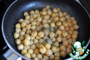На сковороду наливаем растительное масло, нагреваем, кладём отваренный нут, посыпаем семенами кумина, обжариваем до румяности.