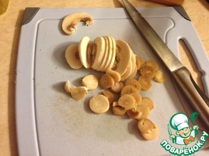 На сковородку добавляем немного растительного масла и обжариваем грибы вместе с луком. В процессе немного солим и добавляем чеснок (лучше всего брать свежий чеснок, но у меня в неизвестном направлении исчезла чесночедавка и я использовала чеснок в виде специй).