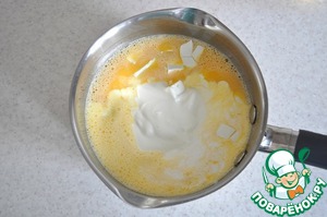 Ко взбитым яйцам добавляем сливки, сметану, фету,