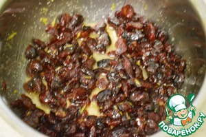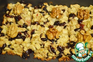 • 6. Добавить муку с разрыхлителем. Полученную массу переложить в форму, слоем 2-2.5 см, хорошо утрамбовав. Духовку разогреть до 180С. Печь печенье примерно 20 минут. Затем форму вынуть, ножом разрезать печенье на квадратики, на каждый кусочек положить орех и печь еще 3- 5 минут.