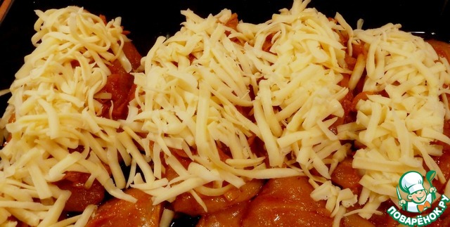 Теперь убираем противень в духовку, разогретую до 180-200 градусов, и ждем 15-20 минут. Чтобы появилась красивая сырная корочка, ставьте противень повыше или включите в конце приготовления ненадолго гриль.