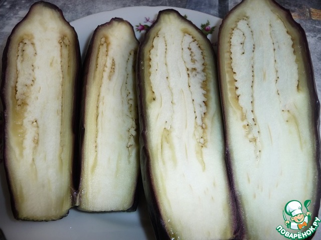 Подваренные баклажаны вынуть, остудить, разрезать вдоль пополам.