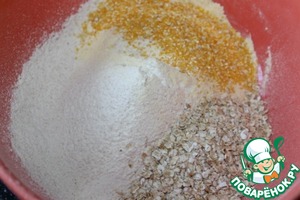 Смешиваем сухое молоко, соль, муку пшеничную, цельнозерновую, овсяные хлопья, кукурузную крупу (можно заменить кукурузную крупу на муку, т. к. крупа грубее, и она будет чувствоваться в готовом хлебе, мне как раз этого и хотелось, чтоб хлеб получился погрубее, итог лично меня очень порадовал, тут дело вкуса), всё перемешиваем.