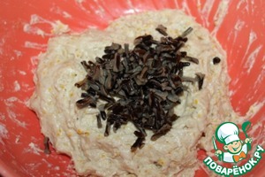 Тесто тщательно обминаем и добавляем отварной рис, хорошо перемешиваем.