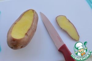 Отрезать небольшой кусочек вдоль длинной стороны картофеля, это нужно для его устойчивости.