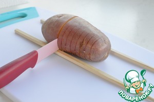 С двух сторон от картофеля положить 2 палочки (мои диаметром 8 мм), сделать надрезы на картофеле примерно по 0,5 см. Палочки не дадут вам прорезать картофель насквозь.