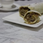 Положить тесто на присыпанное мукой полотенце, растянуть руками (или раскатать скалкой) до полупрозрачного состояния.
