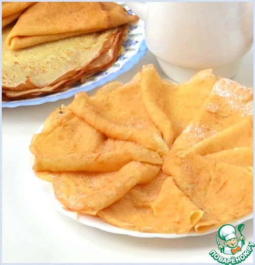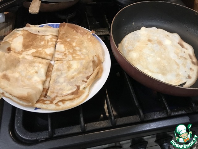 P.S. Хочу отметить нюансы выпечки, которые возможно помогут хозяйкам. При переворачивании эти блинчики требуют более деликатного подхода, чем обычные. Я пеку на толстой, тяжелой блинной сковороде. Для первого блинчика маслом растительным не просто слегка смазываю сковороду, а можно сказать, что чуть-чуть наливаю. Первый блинчик получается конечно жирноватый, но это облегчает дальнейшую выпечку. Теста наливаю мало, блинчики тонкие пеку. Перед переворачиванием слегка лопаткой ( пользуюсь металлической) прохожу по окружности блинчика, отделяя его от сковороды. И только потом завожу лопатку под блинчик и аккуратно переворачиваю. Если у вас нет подходящей блинной сковороды, возможно стоит печь блины по другому рецепту, во избежание разочарования.