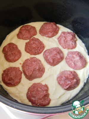 Фарш посолить, поперчить, можно добавить лук. Я использовала куриный фарш, так как он более нежный. Мокрыми руками скатать фрикадельки. Выложить сверху на тесто.