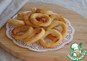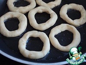 Теперь выкладываем колечки в подсоленное горячее масло и зажариваем на среднем огне до золотистого цвета.