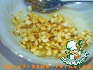 сыр и брынзу также режем кубиками, смешиваем со специями