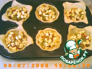 Выложить тесто, в середину положить половинку помидора (у меня были черри), срез помидора "смотрит" вверх.
