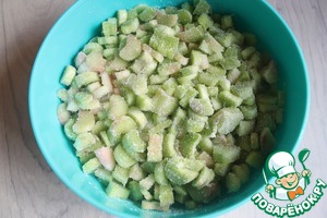 Порежем кубиками ревень. Засыпем сахаром (250гр), закроем крышкой, уберем в холодильник на сутки.