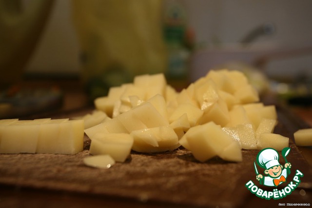 Порезать пару картошек кубиками, высыпать в кастрюлю.