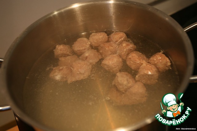 Фрикадельки засыпать в кипящую воду. Можно взять готовые или приготовить самим. Количество расчитываю из расчёта 4 шт. на человека.