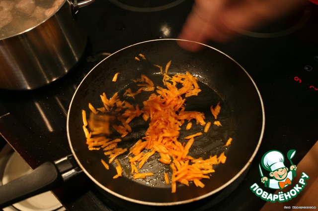 Потереть морковку на тёрке, спассеровать на растительном масле, положить в кастрюлю.