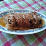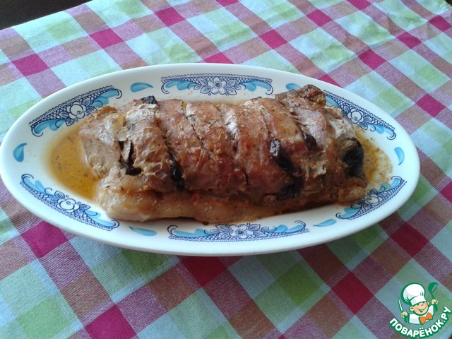 Перекладываем пласты мяса распаренным черносливом. Обмазываем все это маринадом.