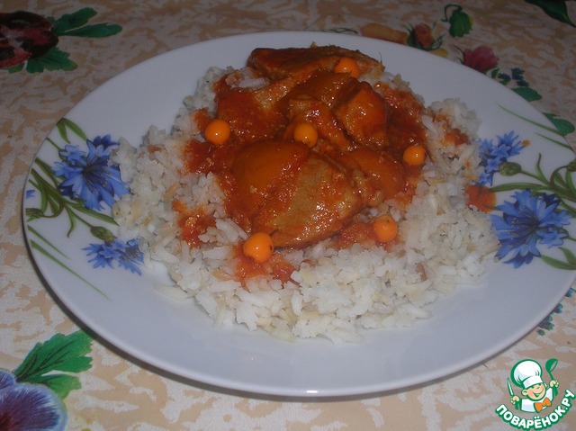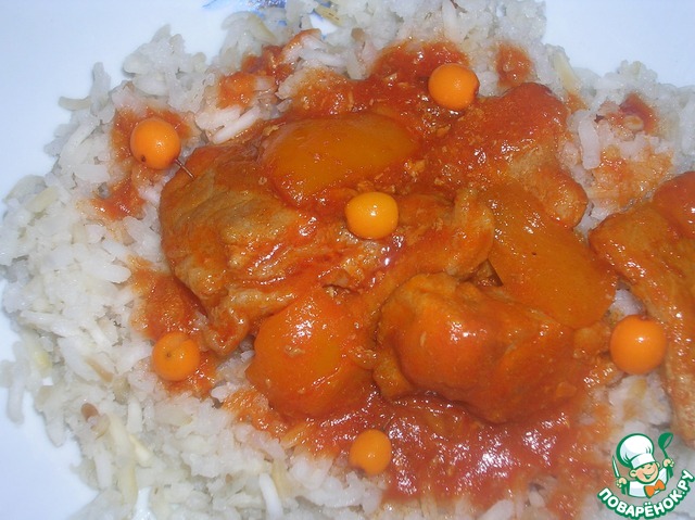 Готовую свинину подавать с отварным рисом и ягодами облепихи.