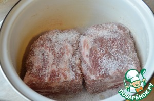 Начну с того, что окорок я поделила на две половины. Мясо необходимо покрыть солью так, чтоб оно было покрыто солью со всех сторон, точное количество соли указать не могу, но мясо должно быть полностью покрыто солью, как у меня на фотографии.