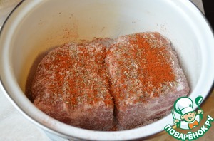 Далее посыпаем мясо приправами. И убираем в холодильник на 3-4 дня. Мясо два раза в день, я делала утром и вечером, необходимо перевернуть, в кастрюльке на второй день будет немного мясного сока, это нормально.