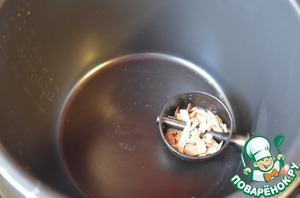 Устанавливаем чашу для копчения (их к скороварке идет две, для копчения и обычная), насыпаем 1 столовую ложку с горкой яблоневую щепу (щепа подойдет от любого косточкового дерева, яблоня, вишня, черешня, слива и т. д.) в специальный металлический контейнер, закрываем его крышкой. Далее устанавливаем решету для копчения. Выкладываем кусочек мяса.