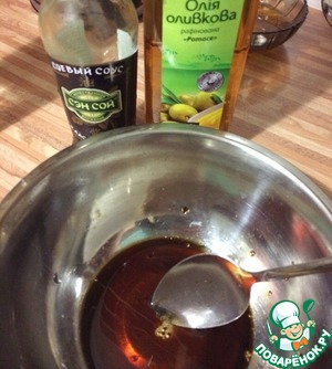 Делаем маринад. Смешиваем соевый соус, перцы, масло.