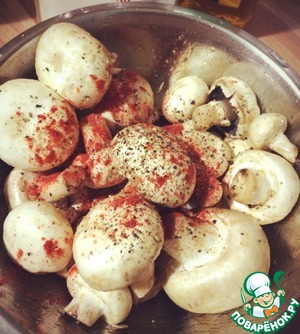 В маринад грибы, засыпаем паприкой и солью немного. Перемешиваем, отставляем на полчаса.