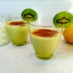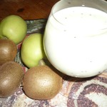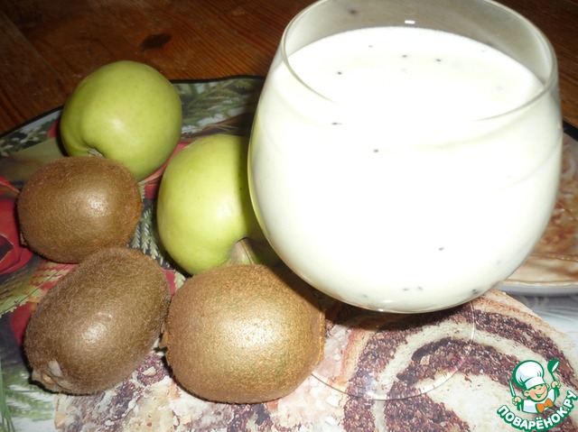 Сделала в виде смузи: все ингредиенты, не очищая киви и яблоко от кожуры, измельчила в блендере. Стакан кефира - 200 мл. Получился освежающий густой напиток