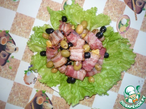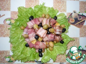 На концы зубочистки надеть оливки (с одной - черные, с другой - зеленые). Готовые рулетики выложить на листья салата. И подавать к столу.