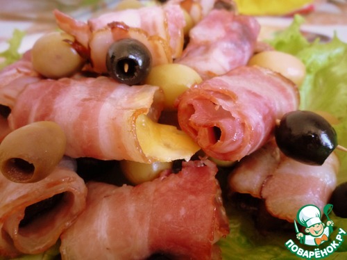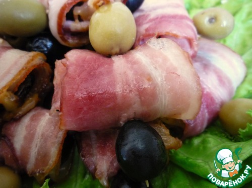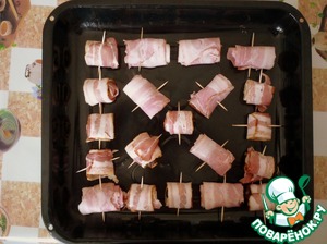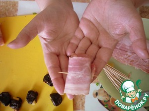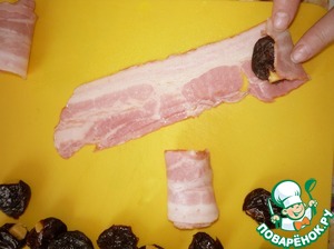 Теперь каждый чернослив заворачиваем в бекон, формируя рулетик.