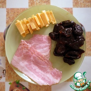 Подготавливаем продукты: сыр нарезаем брусочками, чернослив моем и замачиваем (если он вяленый, то просто обдаем кипятком), бекон достаем из упаковки (и стараемся ничего пока не есть, или берем с запасом). Продуктов ровно на 20 рулетиков.