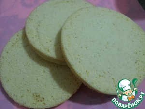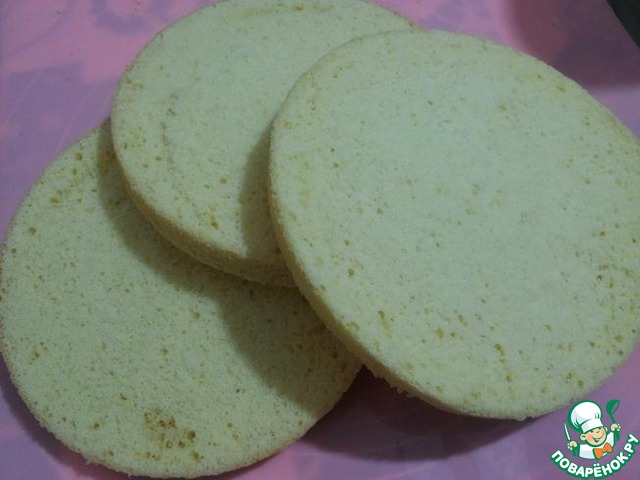 Выпекать в мультиварке в режиме "Выпечка", проверить лучинкой. Вот мой корж... Дать бисквиту остыть.