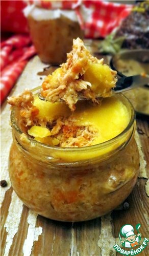Курицу нарезать на небольшие куски, сложить в кастрюлю с толстым дном, залить водой и тушить на самом маленьком огне около 3 часов под закрытой крышкой, можно и больше.