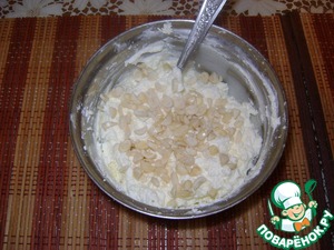 Добавить сметану, сахарную пудру, оставшийся измельченный миндаль, хорошо перемешать.