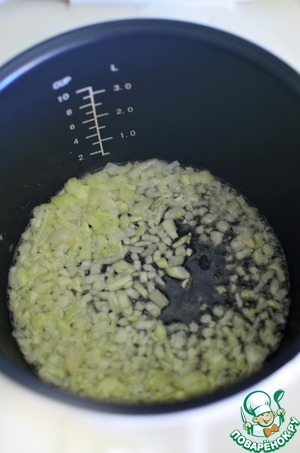 Лук мелко нарезать и обжарить до легкого золотистого цвета на смеси двух масел в режиме Поджаривание. -
