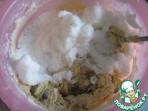 Добавить белки в тесто, хорошо перемешать сверху вниз.