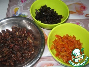 Подготовить сухофрукты: замочить в воде (если они мягкие, то не надо), промыть, курагу и чернослив нарезать мелко.