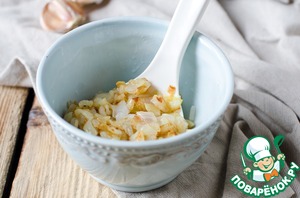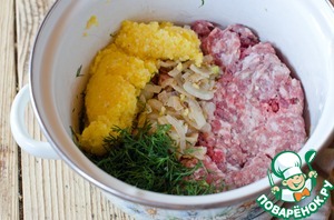 Мясной фарш хорошо перемешать с половиной обжаренного лука, мелко нарезанным укропом и 3 ст. л. распаренной кукурузной крупы. Посолить и поперчить по вкусу.