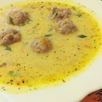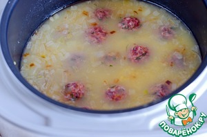 В распаренную кашу влить 3 стак. горячего бульона (можно заменить водой), перемешать, добавить жаренный лук. Выбрать программу "Варка" и установить время 30 минут. Довести суп до кипения и опустить фрикадельки. Варить около 20 минут, затем влить сливки, посолить, поперчить, добавить карри. Готовить до окончания программы.