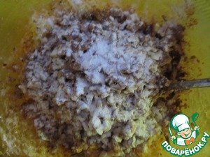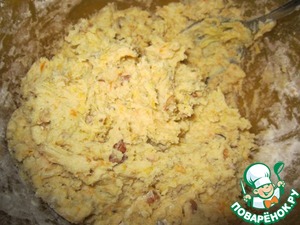 В тесто выдавите сок одного апельсина. Орехи измельчите в блендере до мелкой крошки (не в муку) и тоже добавьте в тесто. Добавьте молотый кардамон и мускатный орех. Тщательно перемешайте.