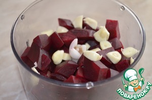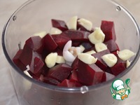 В чашу блендера выложить фасоль, свеклу, чеснок, оливковое масло, соль. |