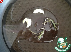 На разогретую сковороду кладем веточку розмарина и раздавленный зубчик чеснока. Через 1-1.5 минуты чеснок убираем - он уже отдаст свой аромат.