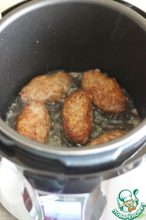 Затем в чашу мультиварки влить масло и обжарить в режиме "Meat" котлеты до золотистой корочки с двух сторон