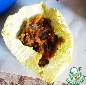 В каждый листочек савойской капусты завернуть 1 ст. л. обжаренных овощей с чечевицей.