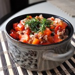 Добавить томаты, рис и 1 стакан воды, перемешать, довести до кипения и готовить 20 мин. при режиме Тушение.