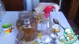 Теперь квас нужно процедить. В приготовленные чистые бутылки засыпем по вкусу сахар ( у меня 1 ст. л. фруктозы на 1 л кваса), затем осторожно, стараясь не поднять осадок со дна, процедим напиток через марлю, отжимая жидкость из кусочков.