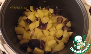 Картофель режем не мелкими кубиками, выкладываем в чашу мультиварки к луку и грибам.