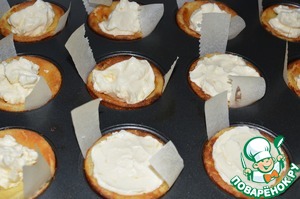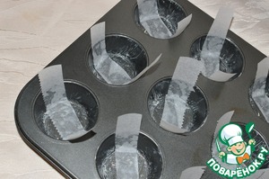 Разогрейте духовку до 180гр. Смажьте маслом форму для маффинов или маленькие формочки для кексов. Вырежьте из бумаги для выпечки полоски примерно 12 на 2,5 см и вставьте их в формочки, после выпечки вы сможете безпроблемно вынуть готовые тортики.