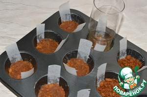 Растопите 50г сливочного масла и смешайте с крошкой из печенья. Разложите по 1,5 ч. л. с верхом в каждую формочку. Прижмите основу, с этим прекрасно справится стакан. Основа получится высотой примерно 1см.