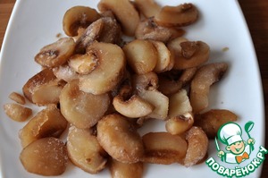 Грибы нарезаем. У меня мороженные нарезанные шампиньоны. Можно также брать любые лесные, свежие или замороженные грибы.